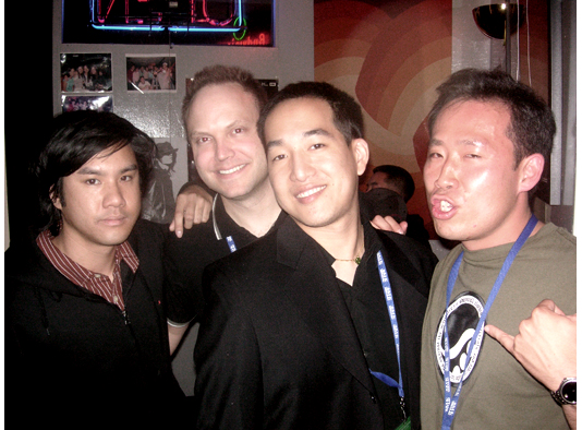 Taken a few weeks ago at the San Diego Asian Film Festival. From l-r - Yours Truly, Mr. Doyle, Mr. Wyman and Mean Gene. We all used to run the DC APA Film Festival together. Yours Truly is now out in LA trying to stand on his own two feet, Mr. Doyle is a superstar network technician and is still involved with the DC APA Film Festival, Mr. Wyman is now head of programming at the DC APA Film Festival and Mean Gene is the programming director for the SDAFF Festival.